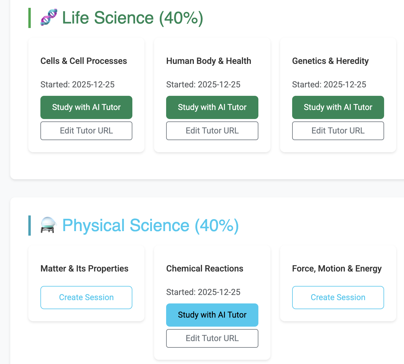 Use your dedicated science AI tutor for focused learning and track your progress across all topics.