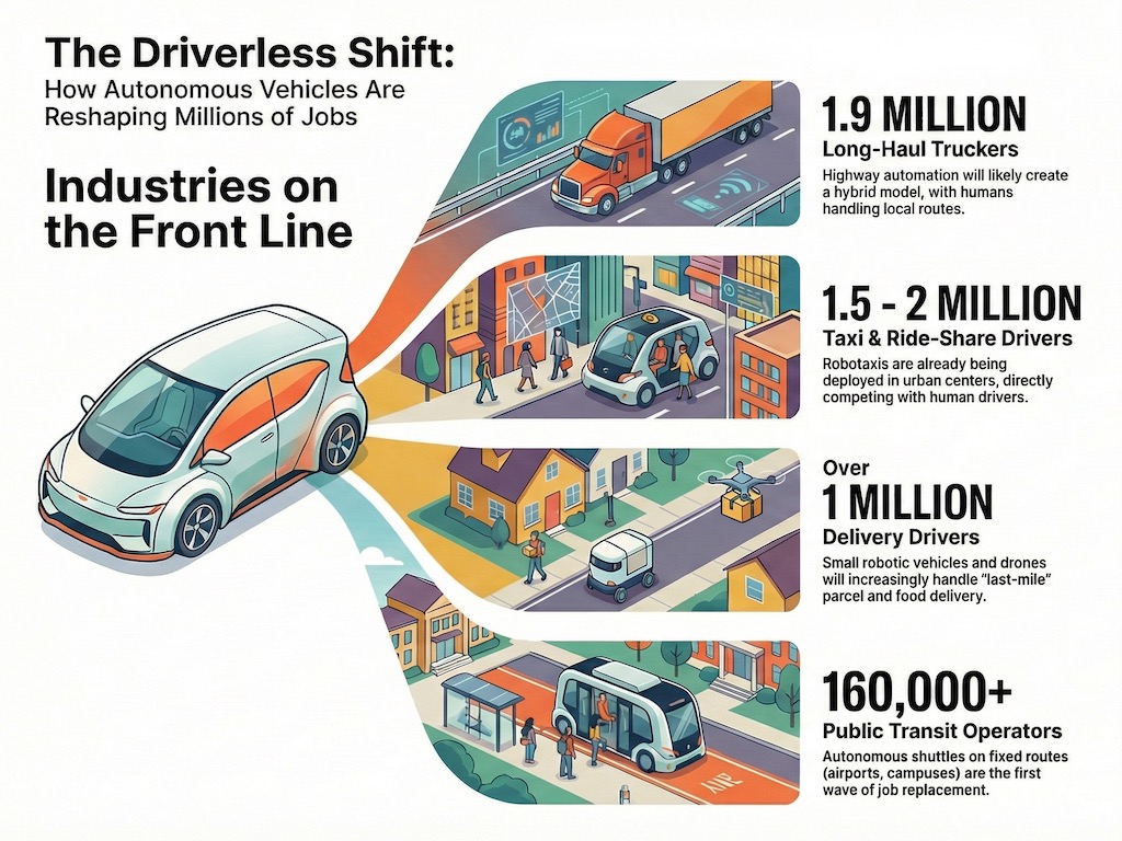 Driving is one of the largest labor categories in the United States. Millions of people earn their living behind the wheel, forming a workforce that is often invisible in daily life. Autonomous vehicles threaten not just a few jobs but entire ecosystems of employment, and the effects ripple far beyond the driver's seat.
