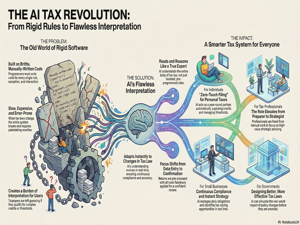 Because tax law is a domain of confined complexity (bounded by specific rules but immensely intricate), AI's ability to constantly update, cross-check, and validate rules makes the system exponentially more reliable and accurate than any manual programming ever could. The result is a tax system that is more accurate, more transparent, and far easier to navigate for every individual and business. AI doesn't rewrite the rules; it simply applies them flawlessly.