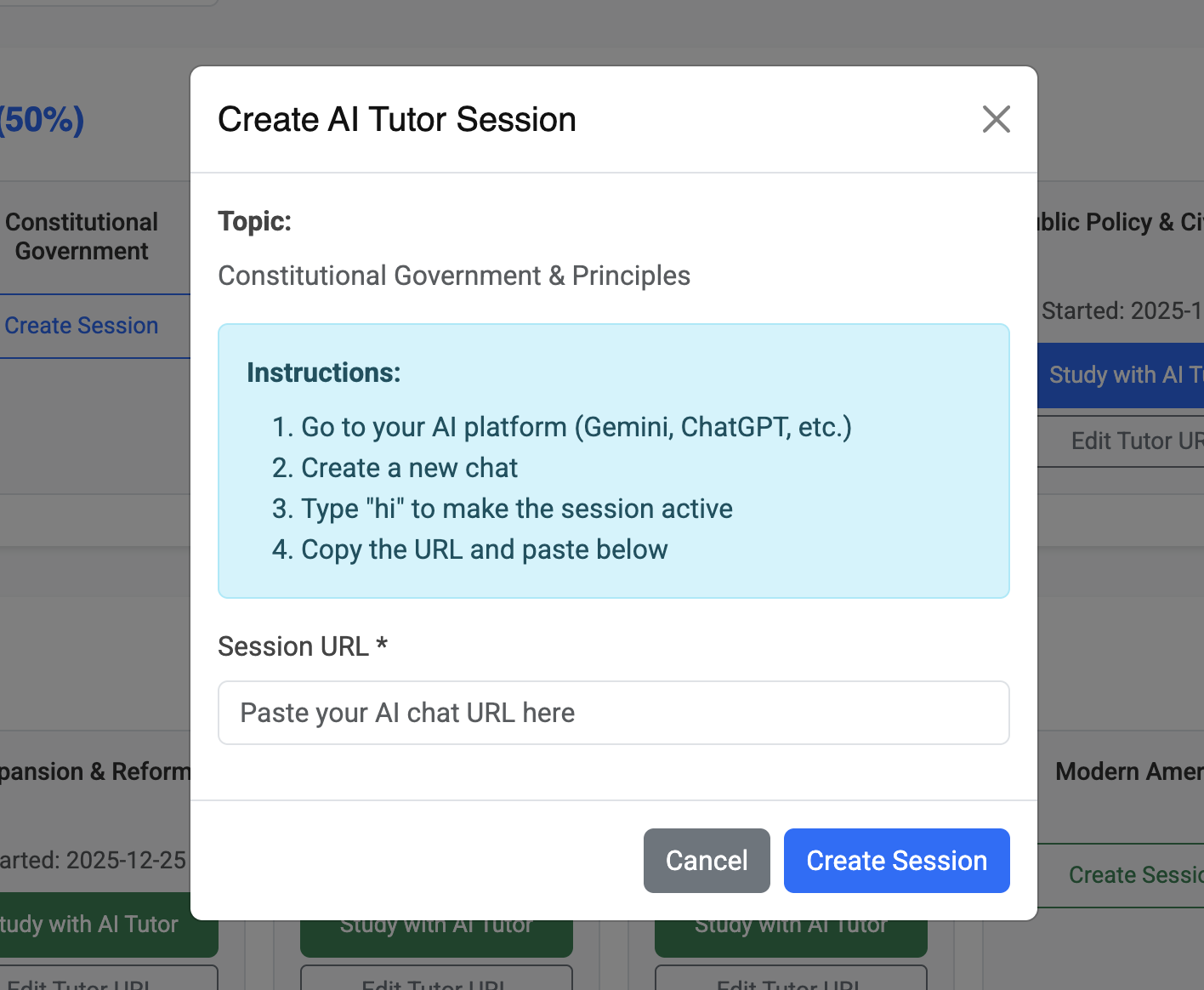 Instead of generic AI chats, each tutor is specialized for specific topics like "Constitutional Government" or "Supply & Demand" - ensuring focused, relevant discussions.